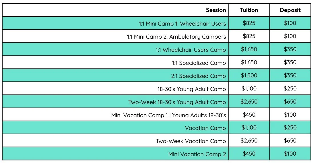 Step 1: decide which session your camper wants to attend; noting the cost of tuition, the deposit amount, and how much your camper can contribute toward the cost of camp. Deposit details are listed in the table below.